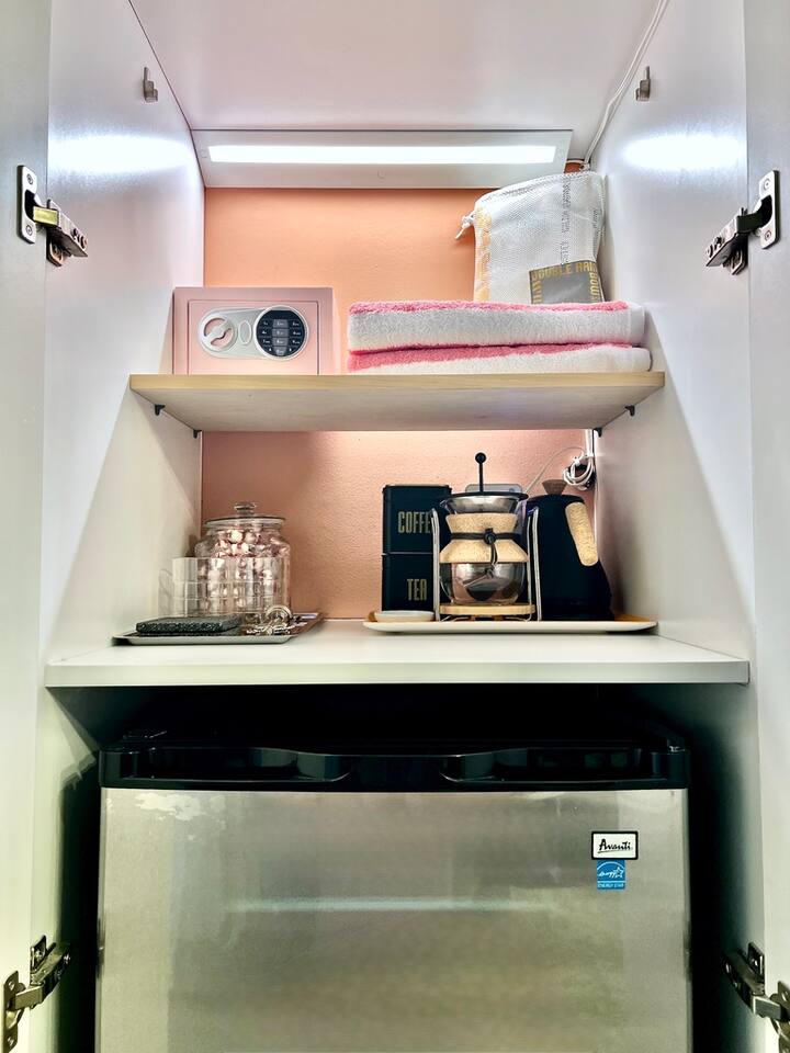Indulge in the epitome of elegance with two interconnected efficiency suites, each featuring a sumptuous king-sized bed and a private en-suite bathroom. Nestled within an exclusive boutique hotel ambiance, this exquisite retreat is part of the renowned Double Rainbow Suites collection, perfectly situated in the vibrant Wilton Manors and Fort Lauderdale area. Luxuriate in this beautifully appointed efficiency featuring a King bed, private en-suite bath, coffee station, and mini fridge.